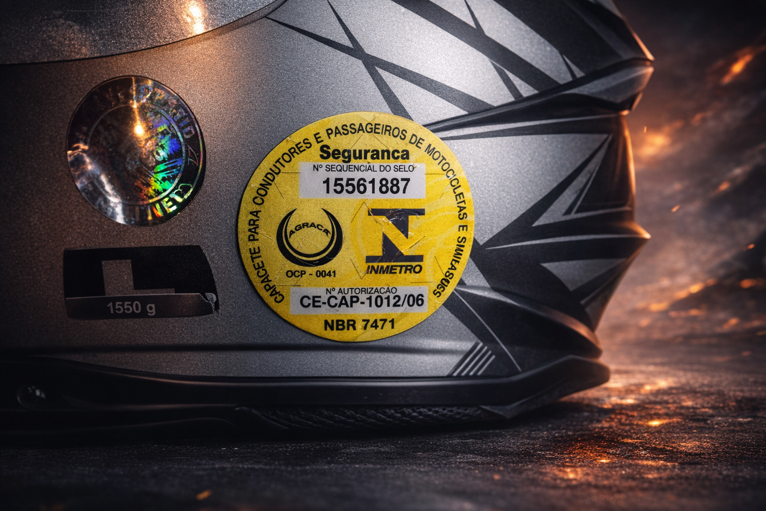 Capacetes aprovados pelo Inmetro com selo de certificação visível, destacando segurança e conformidade com as normas brasileiras.